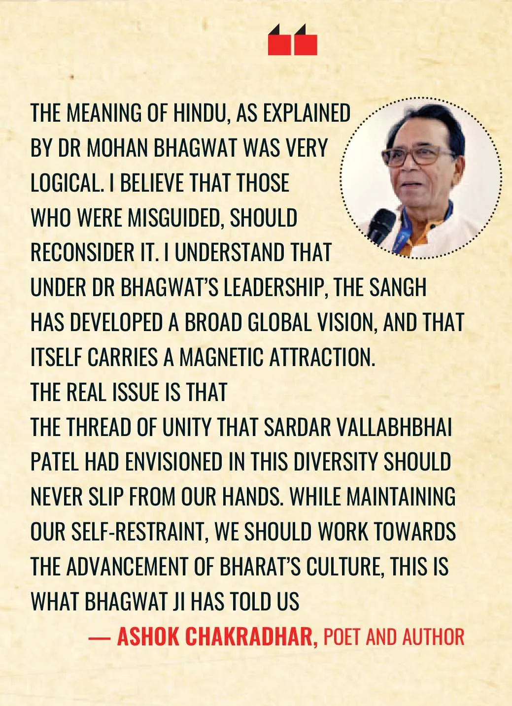 Dr Bhagwat emphasised, “Hindu means one who follows his own path, does not force others to change theirs, and respects others’ faith. Those whose tradition and sanskriti embody this spirit are Hindus. Our aim is to organise the entire Hindu society. To say ‘Hindu’ does not mean Hindu versus all; it means inclusive.”
