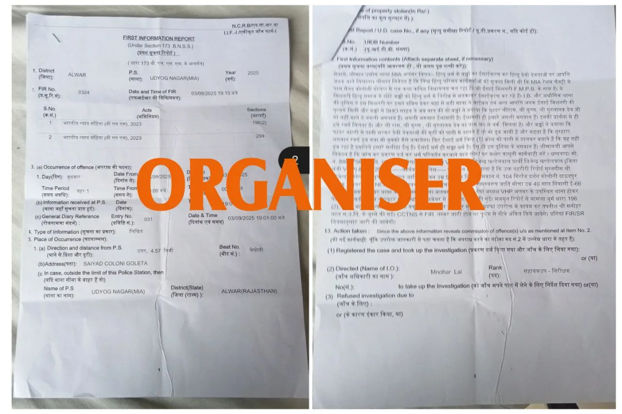 Based on the complaint of Vijendra Khandelwal, a local Hindu activist, the First Information Report (FIR No. 324/2025) was registered at Udyog Nagar Police Station under BNS sections 196(2) and 299.