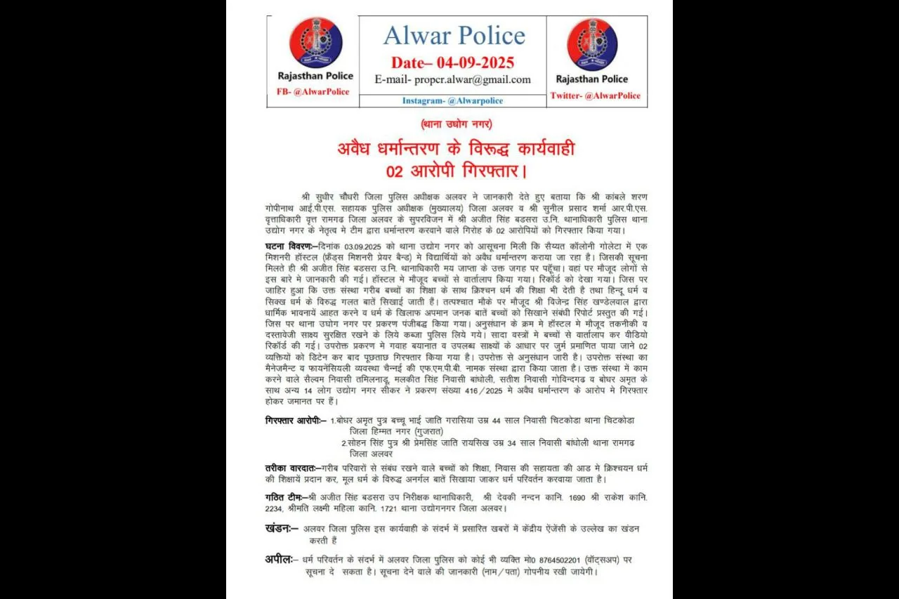 On September 3, Alwar district police, acting on a tip-off from Vishwa Hindu Parishad (VHP) activists, unearthed a religious conversion racket being run under the guise of a missionary hostel. The facility, managed by an organisation called Friends Missionary Prayer Band (FMPB), housed over 80 children, most from Hindu and Sikh families, who were systematically indoctrinated to denounce their faith and accept Jesus as their “only God.”