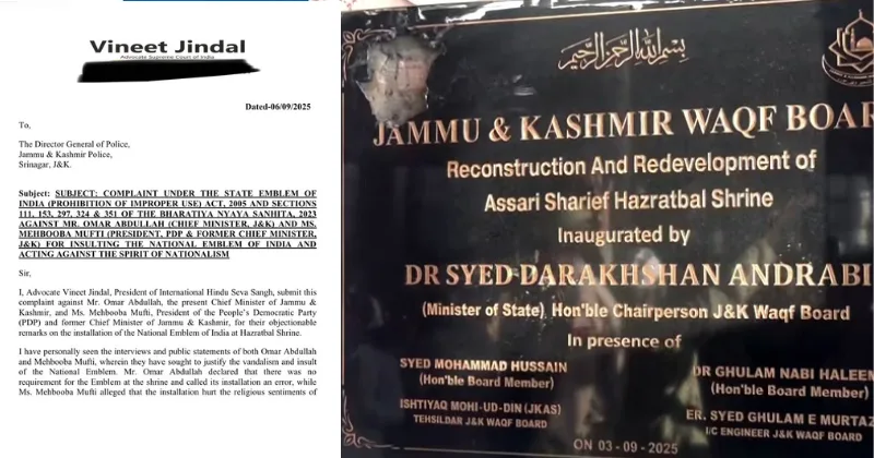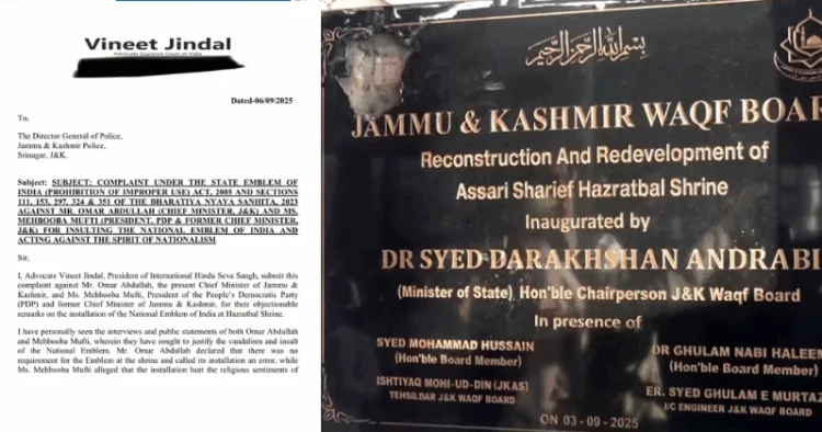 New Delhi/Srinagar, 6 September 2025: Supreme Court Advocate Vineet Jindal has lodged a formal complaint against Jammu & Kashmir Chief Minister Omar Abdullah and PDP President and former CM Mehbooba Mufti, accusing them of justifying the vandalism of the National Emblem at Hazratbal Shrine in Srinagar.