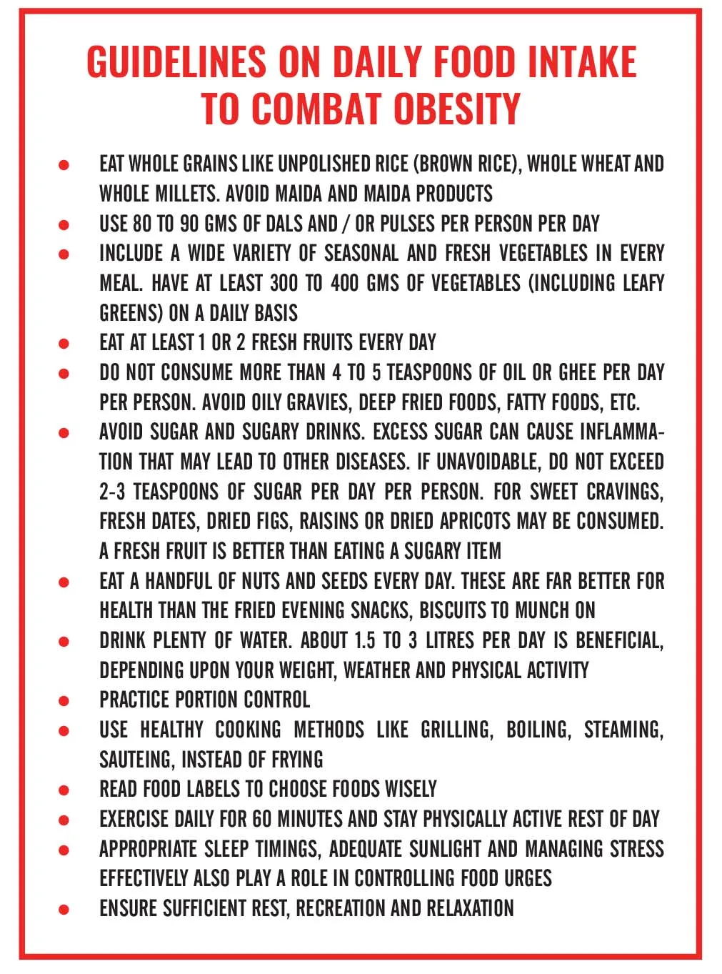 Obesity is not one person’s responsibility. Multiple partners need to come together to combat obesity in our country. Healthcare professionals, especially qualified dietitians-nutritionists, are best equipped to guide individuals in their fight against obesity. To support this, there needs to be involvement from family, close friends, neighbours, co-workers and so on. Engaging local community also helps in encouraging physical activity and eating healthy. Health awareness workshops and lifestyle intervention programmes held at educational institutions, workplaces, public groups, voluntary societies, etc, may go a long way in changing behaviours en masse. Food industries need to be more open to manufacturing healthier foods by reducing fat, salt, sugar, refined ingredients and additives in the packaged foods. People’s choices are moving towards natural, additive-free, sugar-free, clean foods. Government policies need to include supporting healthier foods through incentives to grow & sell whole grains, vegetables, fruits, seeds, nuts, etc, and higher taxes for sugary, high fat, high salt, ultra-processed foods, as also more open spaces and gardens, pollution control and so much more.