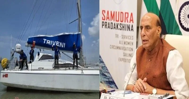 The defence minister reminded the nation of two remarkable officers, Lieutenant Commander Dilna K and Lieutenant Commander Rupa A, who had earlier sailed around the globe in double-handed mode onboard INS Tarini. He said their achievement, is a shining example of courage and dedication. With Samudra Pradakshina, he expressed that India will once again set the global benchmark in maritime adventure.