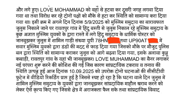 The tension flared again on September 5, 2025, during the Barawafat procession. According to the FIR, “unidentified Muslim youths in a vehicle deliberately used sticks to destroy Hindu religious posters along the road in Rawatpur village.”
