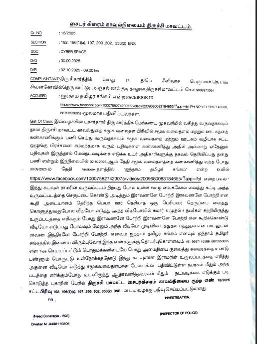 The Trichy Cyber Crime Police initiated action on October 2, registering a case, Crime No. 18/2025, against the Facebook account associated with the Iyantham Tamilar Sangam.