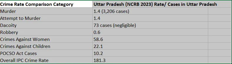 According to the NCRB 2023 report, Uttar Pradesh registered 3,206 murder cases, which equals a murder rate of 1.4 per lakh people. The attempt-to-murder rate was also 1.4. Serious crimes like dacoity and robbery were very low, with only 73 dacoity cases reported and a robbery rate of 0.6.