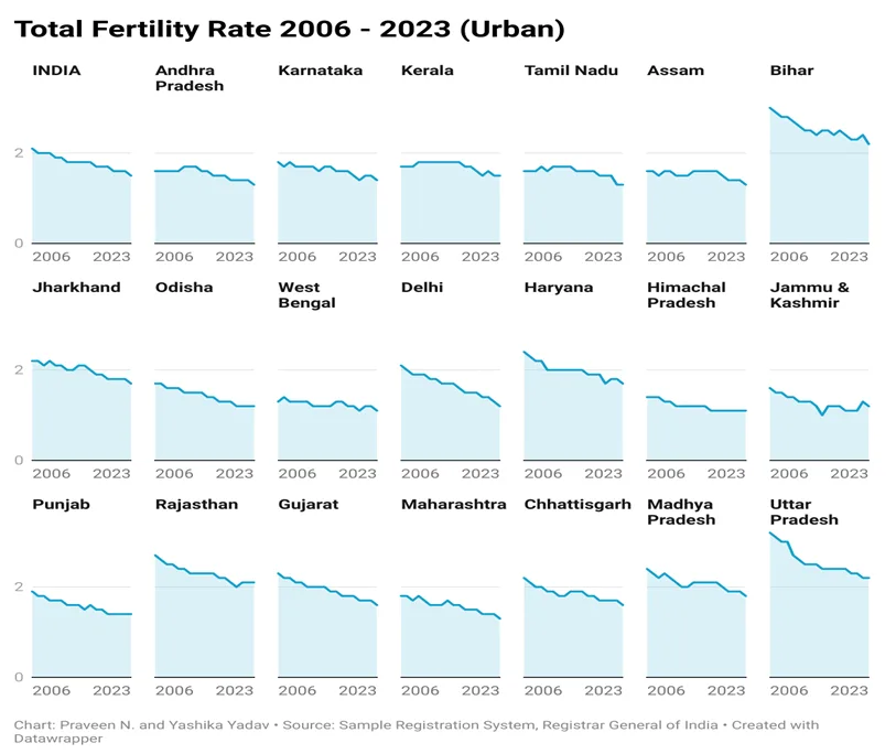 India may still be the world’s most populous country, with more than 1.4 billion people, but beneath the surface a quiet crisis is unfolding. Indians are having fewer children than ever before, and the decline is sharper and faster than almost anywhere else in the developing world. The latest Sample Registration System (SRS) 2023 report makes this plain. In urban India, fertility has already slipped below the replacement level of 2.1 children per woman in 17 of 20 major states. Back in 2006, that was true of just 11 states. In rural India, 11 states are now below replacement, compared to only two then. What was once hailed as a victory for family planning is beginning to look like the start of a birth drought.