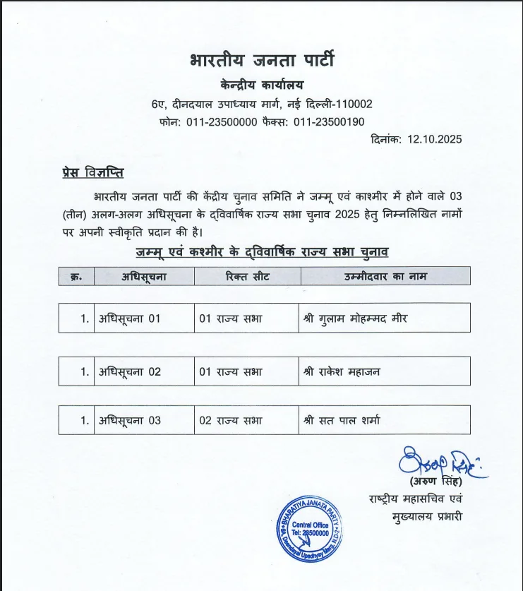 Besides Sharma, two more BJP nominees, Ali Mohammad Mir and Rakesh Mahajan, also filed their nomination papers before Secretary of the Assembly Manoj Kumar Pandita who is returning officer for these elections scheduled to be held on October 24. Union Minister Dr Jitendra Singh on Monday said the Bharatiya Janata Party believes that its all three candidates will win the Rajya Sabha polls.