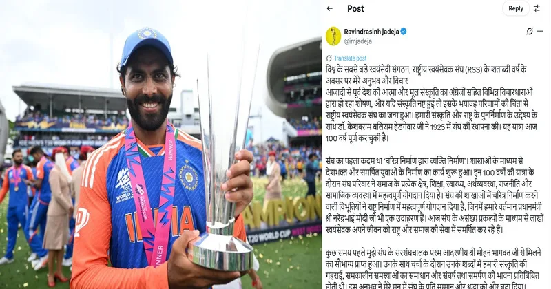Indian star cricketer Ravindra Jadeja on October 14 shared a post for Rashtriya Swayamsevak Sangh (RSS) on its centenary year, calling it a 100-year journey of rebuilding Bharat’s culture and nation and lauding the organisation’s role in shaping youth and national character.
