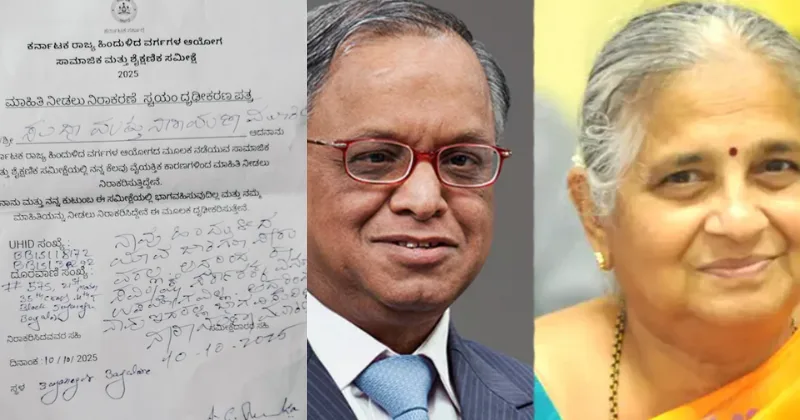 In a self-attested letter submitted to the Karnataka State Backward Classes Commission, the Murthys made it clear that they do not belong to any backward community and, therefore, see no reason to take part in such a caste-oriented enumeration. The couple also expressed their unwillingness to share personal details for the survey, saying their decision was final and self-declared in writing.