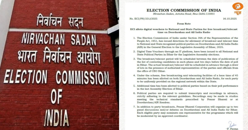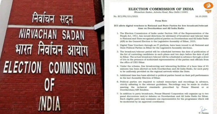 Ahead of the upcoming Bihar assembly elections, the Election Commission of India (ECI) on October 16, issued digital vouchers to all national and regional political parties, directing officials for the allotment of broadcast and telecast time for them on Doordarshan and All India Radio (AIR).
