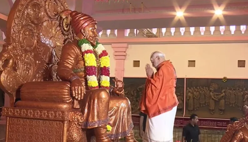 Inside the memorial, the Prime Minister spent time observing the wall murals and paintings depicting key moments from the life of Chhatrapati Shivaji Maharaj. He bowed reverently before the grand portrait of the warrior king and offered floral tributes at the Meditation Hall before the idol of the Ma installed there.
