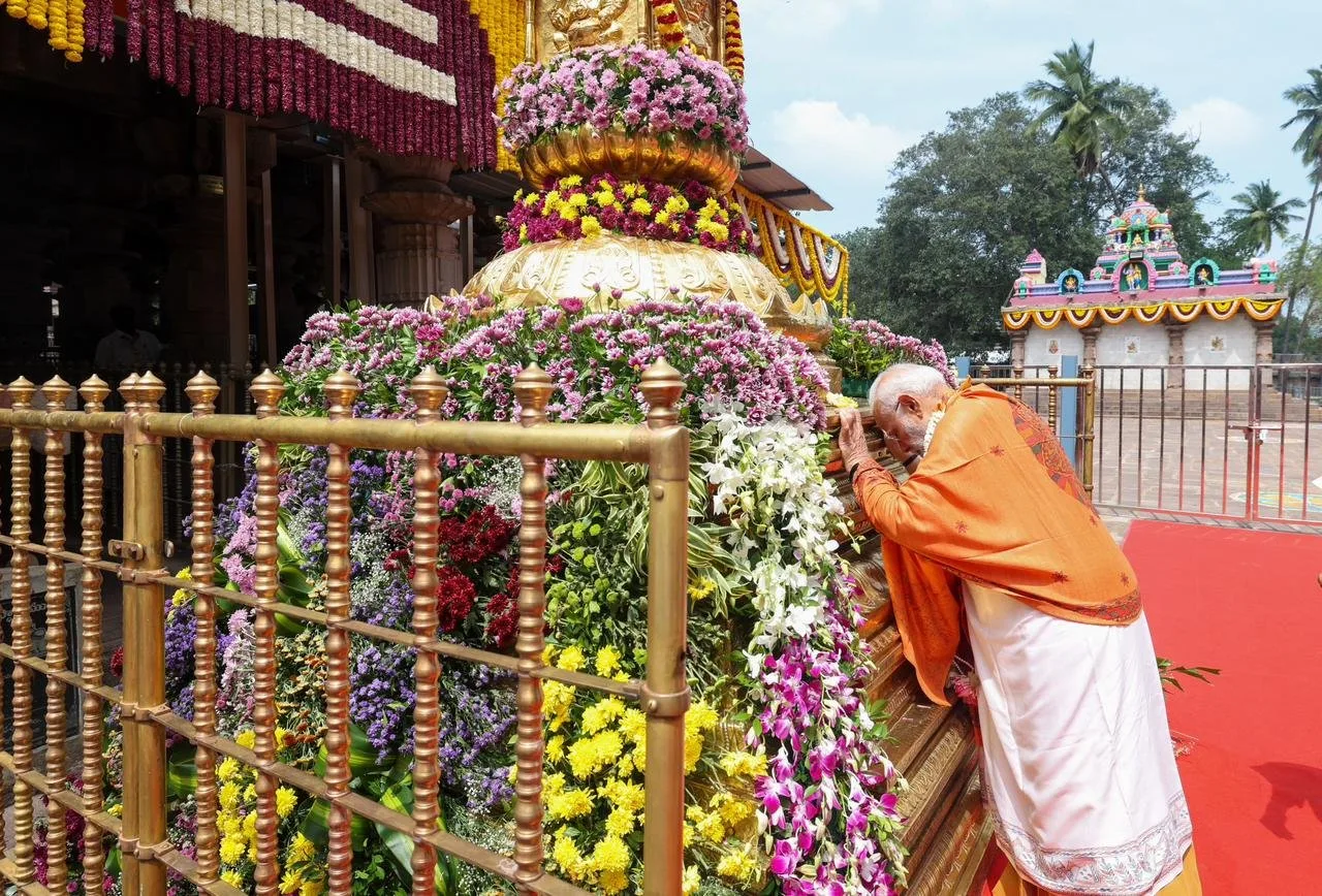 At 11:38 a.m., Prime Minister Modi departed from the Bhramaramba Guest House and proceeded towards the Mandir, accompanied by Andhra Pradesh Chief Minister N Chandrababu Naidu and Deputy Chief Minister Pawan Kalyan. As the convoy reached the Mandir entrance, Vedic scholars extended a traditional Poornakumbham welcome, applying vibhooti and kumkum before escorting the dignitaries through the pradakshina path into the Mandir’s sanctified precincts.