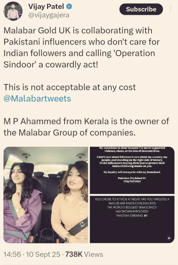 The outrage first flared when Hindu activist Vijay Patel took to X to expose the company’s link with Khalid. His post struck a chord with thousands of patriotic Indians: “So MP Ahammed-owned Malabar Gold wants to send me to jail for exposing their Pakistani influencer collaboration, who mocked our Operation Sindoor.”