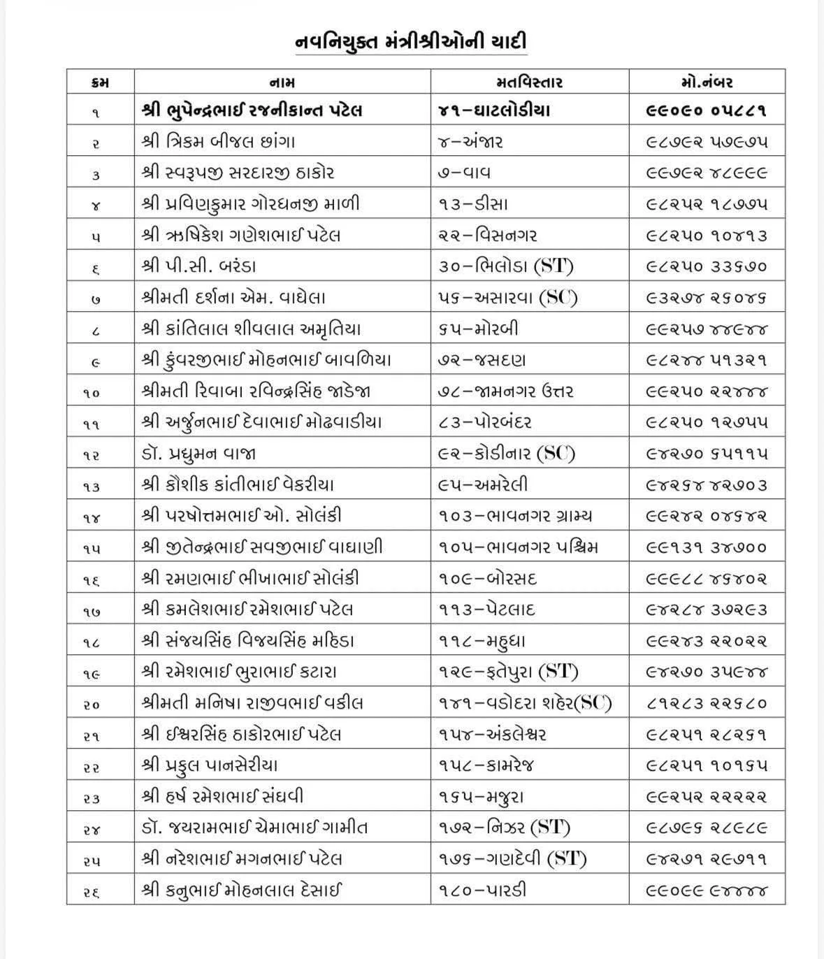 Former Gujarat BJP chief and Bhavnagar MLA Jitu Vaghani, Amreli MLA and BJP’s Deputy chief whip in Assembly, Kaushik Vekariya; Banaskantha MLA Swarupji Thakor, Anjar MLA Trikam Chhanga, Nizar MLA Jayram Gamit, Jamnagar North MLA Rivaba Jadeja; Bhilloda MLA PC Baranda, Dahod MLA Ramesh Katara, Ankleshwar MLA Ishwarsinh Patel, and Deesa MLA Pravin Mali, Borsad MLA Ramanbhai Solanki, Petlad MLA Kamlesh Patel, and Mahudha MLA Sanjay Singh Mahida are also a part of the new cabinet.
