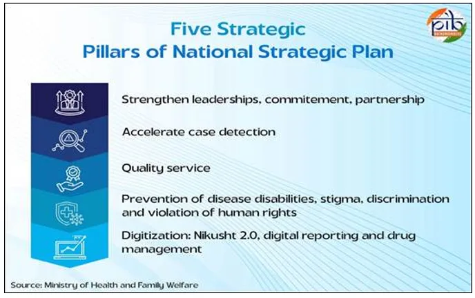 According to the Global Leprosy Strategy 2021–2030 and WHO’s Roadmap for Neglected Tropical Diseases, India’s National Strategic Plan (NSP) 2023–2027 targets interrupting transmission by 2030. It emphasizes targeted detection, new diagnostic tools, chemoprophylaxis, antimicrobial resistance surveillance and post-treatment care.