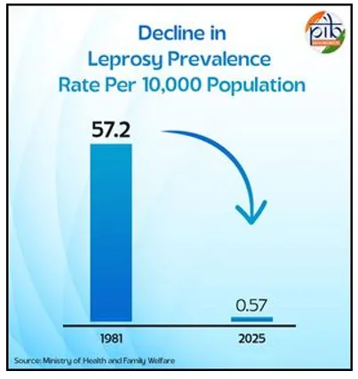 As of March 2025, 31 states and 638 districts record prevalence below one case per 10,000 people. The prevalence rate has fallen from 57.2 per 10,000 in 1981 to just 0.57 in 2024–25. New case detection declined from 9.73 per 100,000 (2014–15) to 7.0 (2024–25). Child cases dropped from 9.04 per cent to 4.68 per cent in the same period, reflecting reduced transmission. Grade 2 disability declined from 4.68 to 1.88 per million showing early detection success.