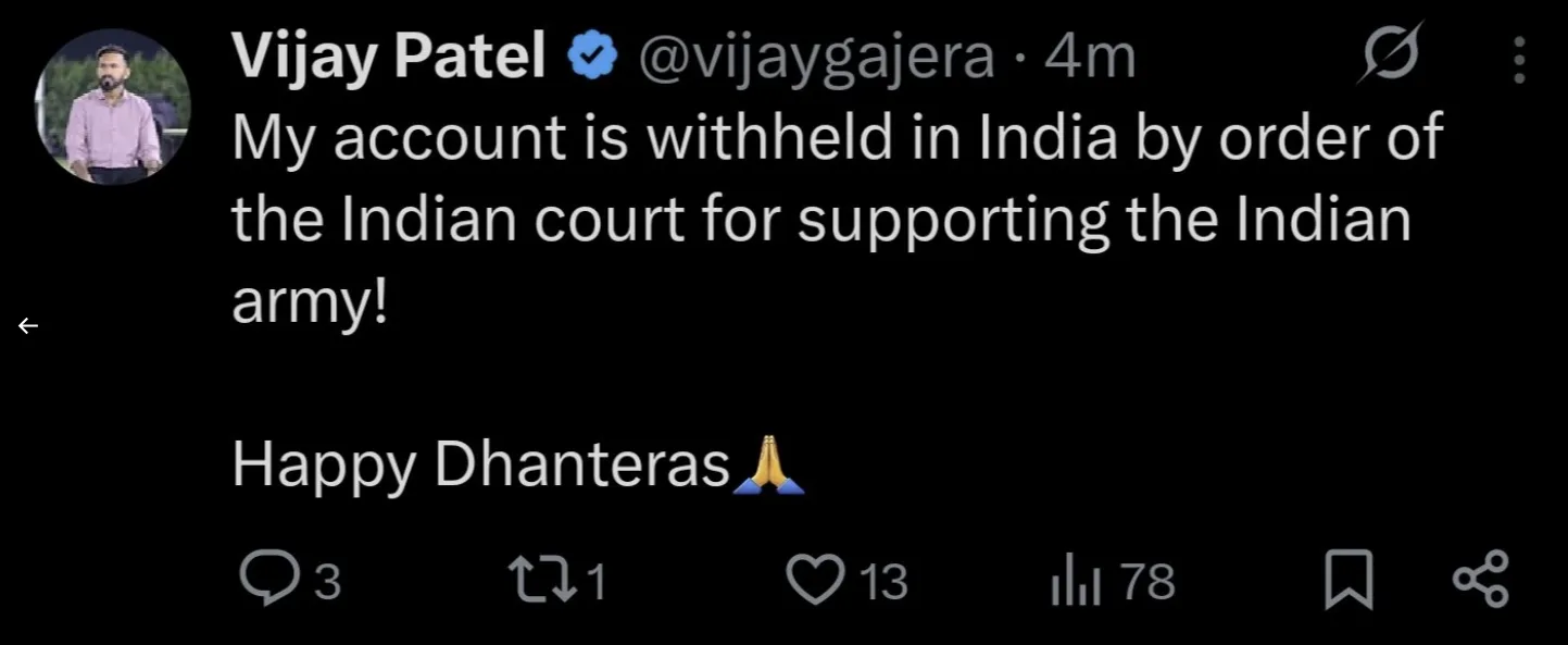 Patel announced the withholding of his account with a defiant post stating, “My account is withheld in India by order of the Indian court for supporting the Indian Army! Happy Dhanteras.” His message quickly went viral, with thousands expressing concern over what they view as an alarming case of corporate power being used to suppress free speech and nationalist expression.