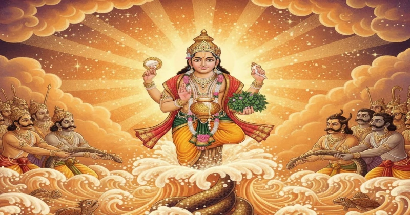 The story of Dhanteras comes from the famous tale of Samudra Manthan, the churning of the ocean by gods (Devas) and demons (Asuras). Both sides were trying to get Amrit, the nectar that gives immortality. During this churning, many valuable things came out of the ocean, and among them was Bhagwan Dhanvantari, holding a pot of Amrit. He is known as the doctor of the gods and is believed to have brought Ayurveda, the ancient Indian system that teaches how to keep the body, mind, and soul in balance for a healthy life.