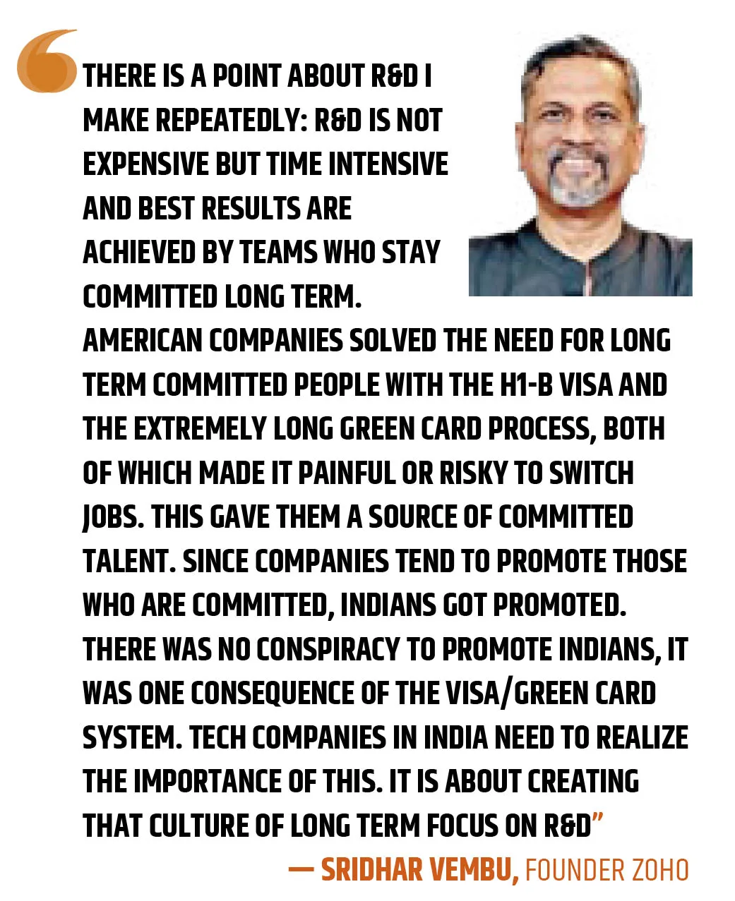Rather than investing millions in glitzy advertising campaigns like other Silicon Valley startups, Zoho is frugal and counts on engineering prowess and word-of-mouth marketing. Its development has been organic, gradually based on trust and dependability. It also goes for a long-term strategy by heavily investing in research and development, working on product innovation. Equally significant is its people-focused culture. Zoho hires much of its talent from rural locations and develops them through its own programme, the Zoho Schools of Learning. Not only does this create an educated and loyal employee base but also brings employees close to the bigger purpose of inclusive growth and self-reliance of the company.