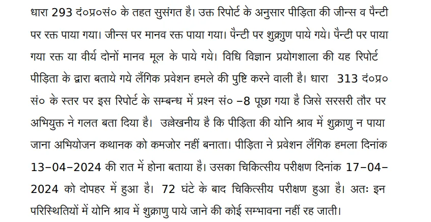 The FSL report primarily highlighted the presence of blood on the jeans. The report also indicate the presence of semen in the underwear. The defence relied on the medical examination, specifically the Supplementary Report, which stated that no spermatozoa were detected in the slide prepared from the vaginal swab.