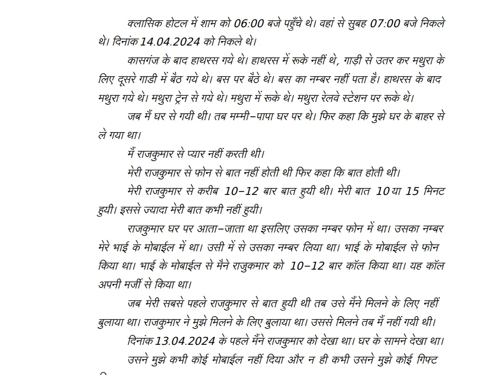 She testified that the accused “did the wrong thing” (“galat kaam kiya”) with her forcibly (“jabardasti”) at the hotel. She further detailed subsequent travel by train to Hathras, Mathura, and Noida before being brought back. Her consistent statements formed the bedrock of the prosecution’s case.