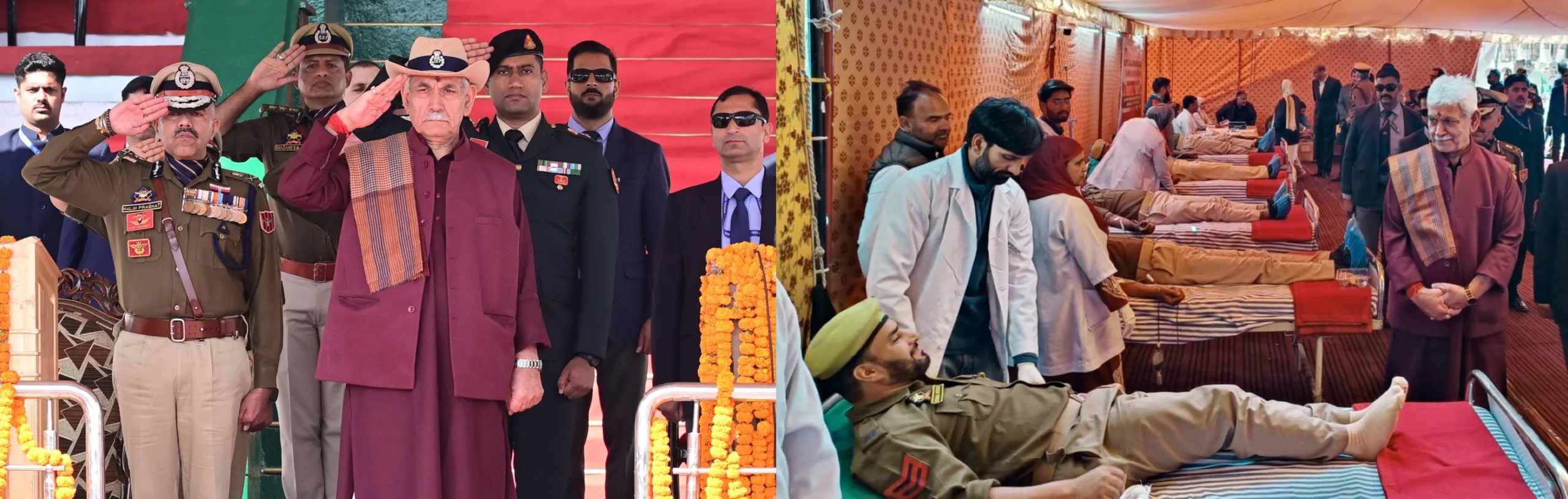 Nalin Prabhat, DGP of J&K Police, read the names of brave-hearts of police who made supreme sacrifice in the line of duty. The arms were reversed and a two-minute silence was observed in the honour of the martyrs. Four policemen had sacrificed their lives battling terrorists in Kathua this year around six months ago. The LG also visited the Blood Donation Camp organized to mark the occasion.