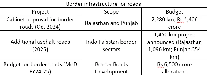 Physical connectivity remains foundational. In October 2024 the Union Cabinet approved construction of 2,280 kilometres of roads in Rajasthan and Punjab at an outlay of Rs 4,406 crore to improve movement and logistics in border areas. In early 2025 the government approved a further project to lay 1,450 kilometres of asphalt roads along key sectors of the India Pakistan border with work targeted at districts such as Barmer, Jaisalmer and Bikaner. These roads shorten response times for patrols, reduce logistical friction and extend the state’s presence to remote villages.