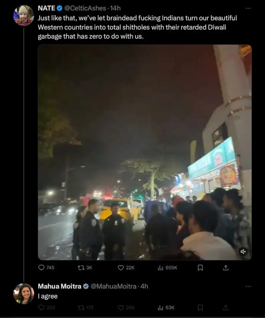 “Just like that, we’ve let braindead f***ing Indians turn our beautiful Western countries into total shitholes with their retarded Deepawali garbage that has zero to do with us.”