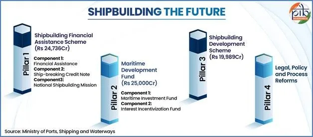 Pillar 1: With an overall outlay of ₹24,736 crore, this scheme is the foundation pillar to build up India’s indigenous shipbuilding and maritime innovation ecosystem. It brings together focused incentives, strategic missions and the lifecycle support mechanisms.