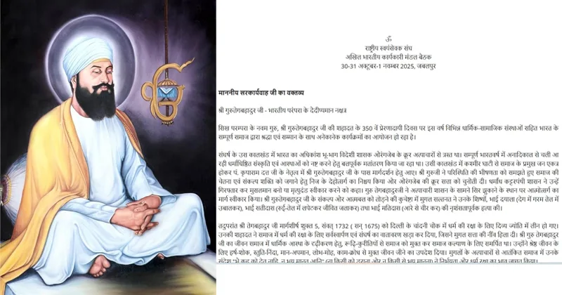 During the ongoing Karyakari Mandal Baithak of the Rashtriya Swayamsevak Sangh (RSS) in Jabalpur, Madhya Pradesh, a statement was issued by Sarkaryavah Dattatreya Hosabale on October 31, 2025, marking the 350th martyrdom day of Sri Guru Tegh Bahadur Ji, which falls on November 24 this year.