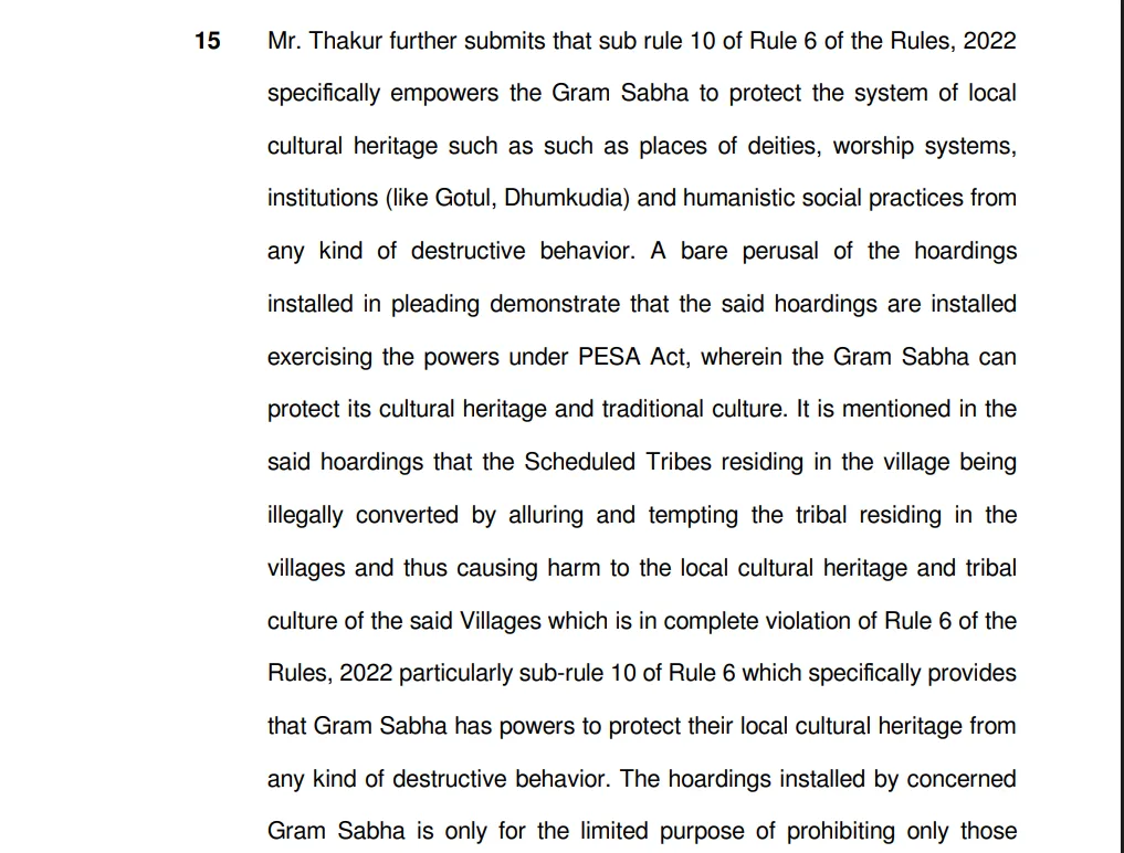 “The hoardings installed by the concerned Gram Sabha are only for the limited purpose of prohibiting pastors belonging to other villages who are entering the village for the purpose of illegal conversion of the tribal peoples,” Thakur argued.