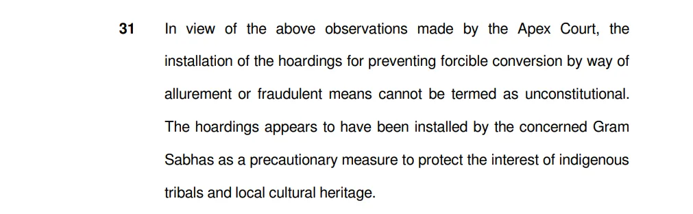 By holding that hoardings against forced conversions are not unconstitutional per se, the bench reaffirmed that the law distinguishes between genuine evangelism and coercive conversion efforts, allowing tribal communities to guard against the latter without infringing upon the former.
