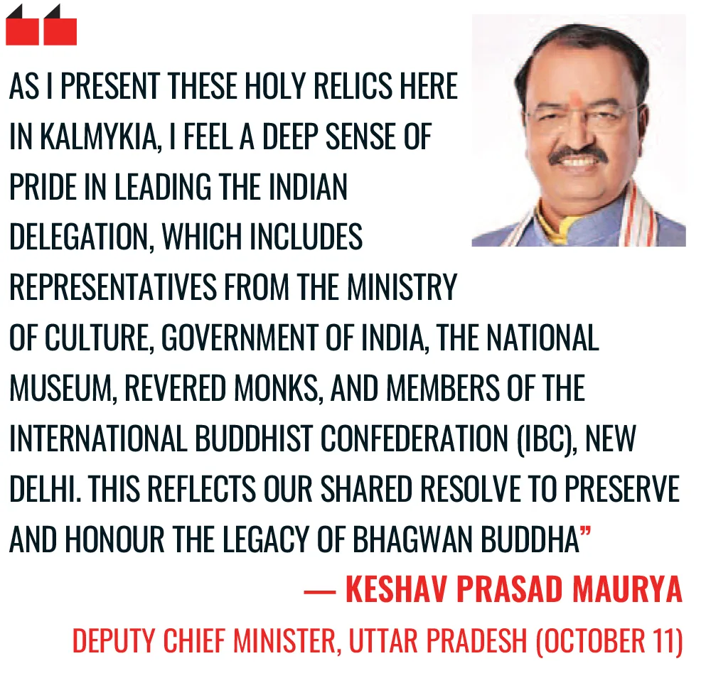 The holy relics exposition, a first in the Russian Republic, was organised by the Ministry of Culture, Government of Bharat in association with the International Buddhist Confederation (IBC), the National Museum, and the Indira Gandhi National Centre for the Arts (IGNCA). It was held in the capital city of Elista from October 11-18, 2025. The sacred relics, recognise as a National Treasure of Bharat, were brought to the capital city of Elista by a high-level delegation, led by Keshav Prasad Maurya, Deputy Chief Minister of Uttar Pradesh, and including senior monks. The delegation conducted special religious services and blessings for the predominantly Buddhist population of Kalmykia, the only region in Europe where Buddhism is the predominant religion.
