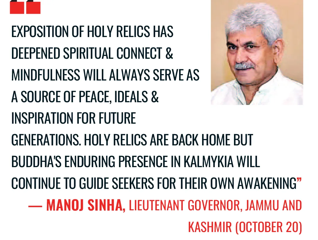 “Exposition of Holy Relics of Bhagwan Buddha to Kalmykia will strengthen the people to people ties between Bharat and Russia,” said Jammu and Kashmir Lieutenant Governor Manoj Sinha on October 18, at the iconic Geden Sheddup Choikorling Monastery, popularly known as the “Golden Abode” of Shakyamuni Buddha in Elista, Republic of Kalmykia, Russia. After paying his reverent homage to the relics, LG Sinha said that exposition of the Holy Relics of Bhagwan Buddha in Kalmykia is a landmark event that represents a historic homecoming of faith for the Kalmyk people, the only Buddhist nation in Europe. It stands as a powerful bridge of spiritual friendship between Bharat and Russia, showcasing Bharat’s efforts in cultural ties and the unifying power of Buddha’s teachings.