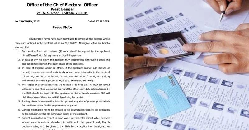 The Chief Electoral Officer (CEO) of West Bengal has issued a circular outlining important guidelines to be followed while filling the voter enumeration form, as part of the ongoing Special Intensive Revision (SIR) exercise. The CEO emphasised that this exercise is a crucial step toward making the electoral roll more accurate, preventing errors or duplications, and strengthening democracy in the state. Enumeration forms have been distributed to almost all electors whose names were included in the electoral roll as on October 28, 2025.