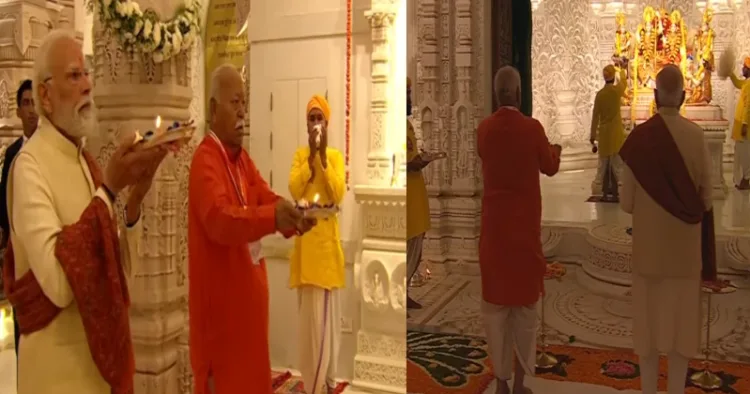 PM Modi who was accompanied by RSS Sarsanghchalak Dr Mohan Bhagwat, Uttar Pradesh Chief Minister Yogi Adityanath and Governor Anandiben Patel, and offered prayers at Mata Annapurna Mandir. He also offered prayers at the Saptmandir at the Ram Janmabhoomi Mandir premises, ahead of the flag-hoisting ceremony at the Mandir.