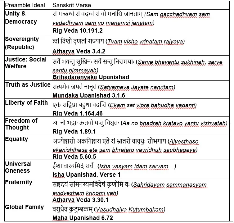 It is imperative to reflect upon the fundamental civilizational values and their intrinsic link with constitutional values, as this forms a prerequisite for comprehending and consciously endeavoring to embody them as a citizen. Below is a comparative analysis of the Preamble’s ideals and corresponding civilizational values, supported by relevant Sanskrit verses.