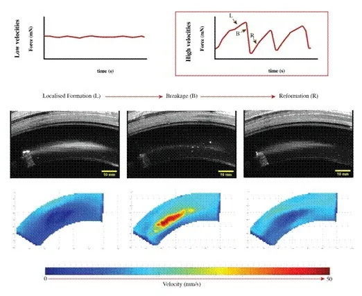 High speed imaging revealed the origin of these bursts. At higher probe speeds, a stream of fluid around the moving probe developed a tail like wake and a structure formed when micelles stretch out. As this wake grew in size until stress became strong enough for it to detach abruptly, its rapid detachment corresponded exactly with the drop in force recorded in the mechanical measurements.
