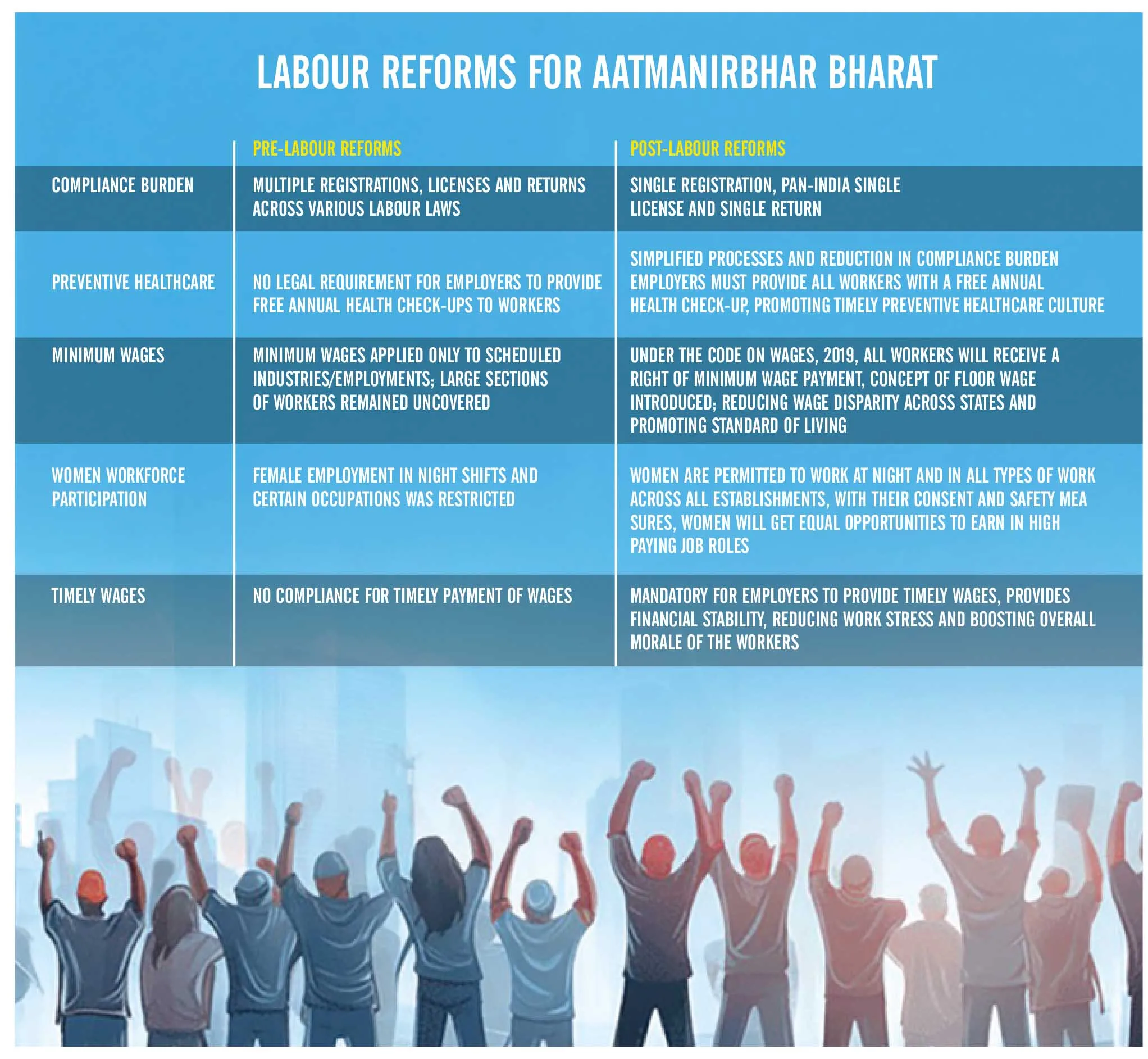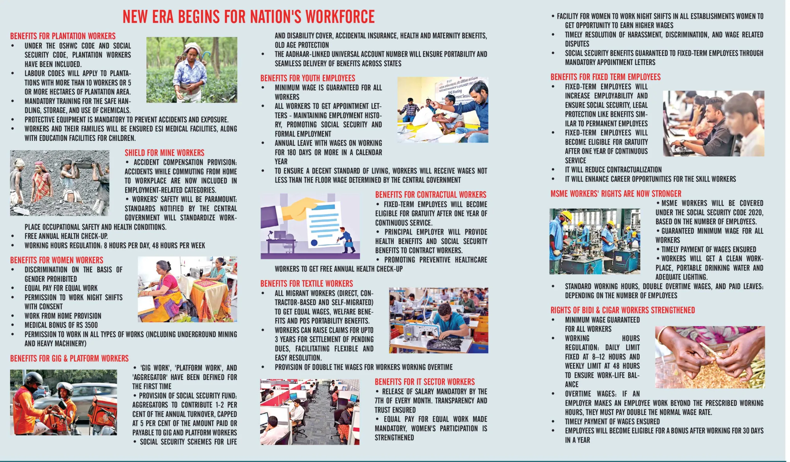 The Employees’ Provident Fund, Employees’ Pension Scheme, and the Employees’ Deposit Linked Insurance Scheme now apply uniformly to all establishments employing 20 or more workers. Social security enrolment has been decentralised through “workers’ facilitation centres” at lower levels. This will help address the inadequacy of the labour department’s limited strength in handling the vast working population that will now come under the beneficial protection of the Labour Codes. Compensation is assured for accidents occurring while travelling to and from the workplace, thereby settling the legal ambiguity that once surrounded such situations.