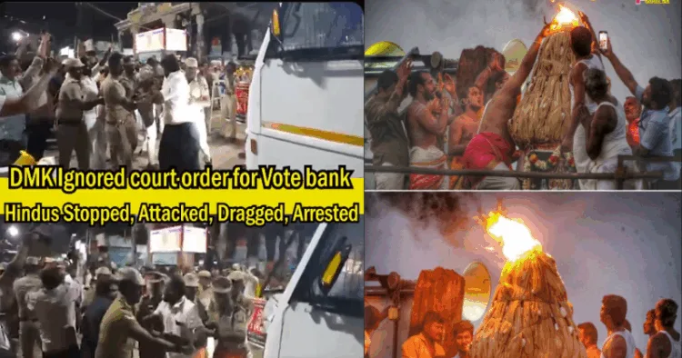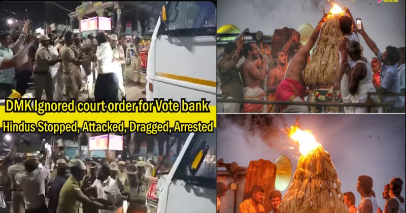 As the deadline drew near, the Deepam was lit at the Uchi Pillaiyar Temple at 6 p.m., but the Deepathoon remained unlit in direct violation of the High Court’s order. Barricades were erected around the stone pillar, and heavy police deployment prevented devotees from proceeding to the top of the hill.