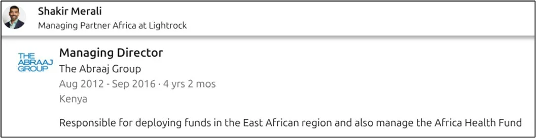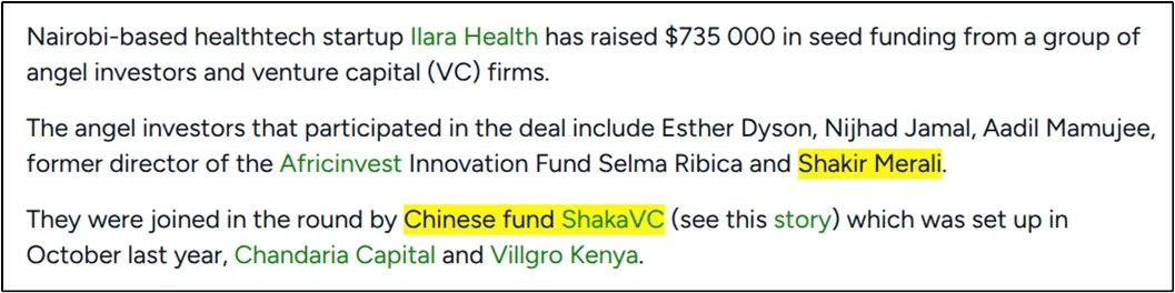 Shakir Mohamed Nurali Merali had held the senior positions in Abraaj. The institutional culture he operated within included Chinese state deals, bribes and political money flows. Shakir Mohamed Nurali Merali has invested in Chinese state enterprises. Shakir is also an angel investor in Ilara Health, a Nairobi healthtech startup backed by Chinese Fund ShakaVC. His investments directly overlap with Chinese backed funds and portfolios.