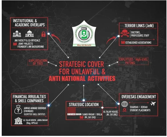 - Based on the evidence presented in this report, it is concluded that the network surrounding Al-Falah University, its founder and its associated corporate entities operates as a structured ecosystem susceptible to exploitation for anti-national purposes. The strategic use of the Jamia Nagar location, the deliberate employment of individuals with links to prestigious institutions like JMI and the established connections to banned and active Islamic groups in the vicinity collectively contribute to a highly volatile environment. Immediate and comprehensive investigative intervention is required to map and neutralize this entire nexus.