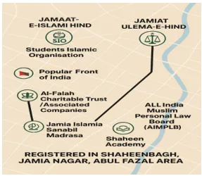 - Jamaat-e-Islami Hind (JIH) (Abul Fazal Enclave, Jamia Nagar), Students Islamic Organisation (SIO), (Abul Fazal Enclave, Jamia Nagar). The banned terror organisation Popular Front of India, its office and associated centres were active in the Okhla/Shaheen Bagh region. Al-Falah Charitable Trust / Associated Companies, Jawad Ahmad Siddiqui, is specified as Al Falah House, Jamia Nagar, Okhla. Jamia Islamia Sanabil Madrasa, and Shaheen Academy, registered address, Shaheen Bagh/Jamia Nagar belt.