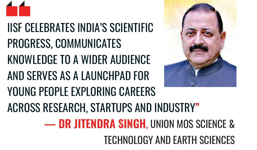 Inaugurating IISF 2025, Dr Jitendra Singh was careful to stress what makes the festival different from a typical scientific meet. IISF, he said, was conceived as an open, public-facing festival, not a closed-door technical conference. It is meant to take Science “beyond laboratories and into the public domain”, allowing ordinary citizens, especially students and young researchers, to directly engage with India’s scientific achievements and emerging technologies. He framed IISF as a national platform built on celebration of achievements, communication of knowledge, and career opportunities for the next generation. “By bringing scientists, institutions and the beneficiaries of research onto one common platform, IISF reflects the government’s push to break silos between science ministries and link innovation with governance.”